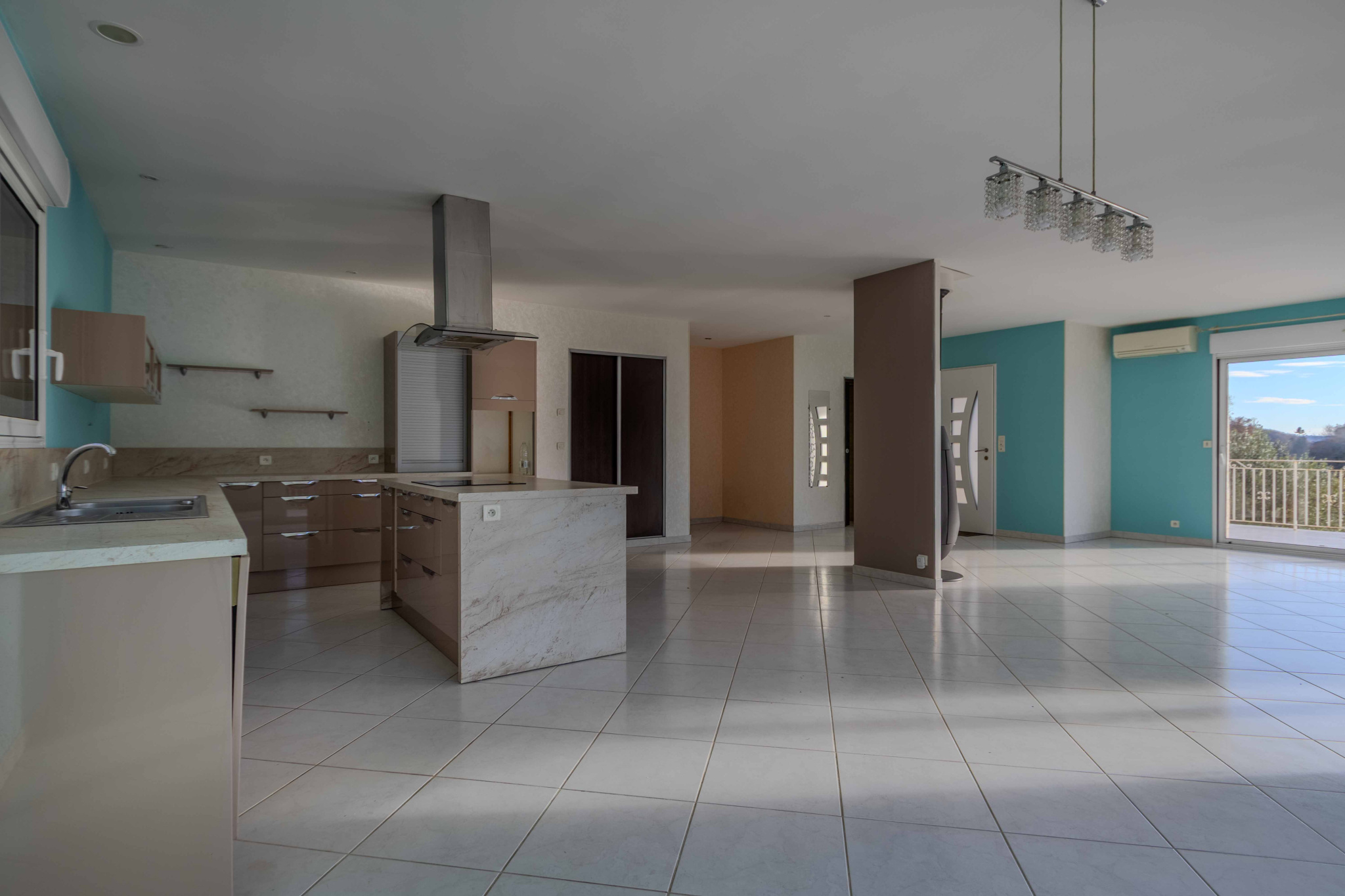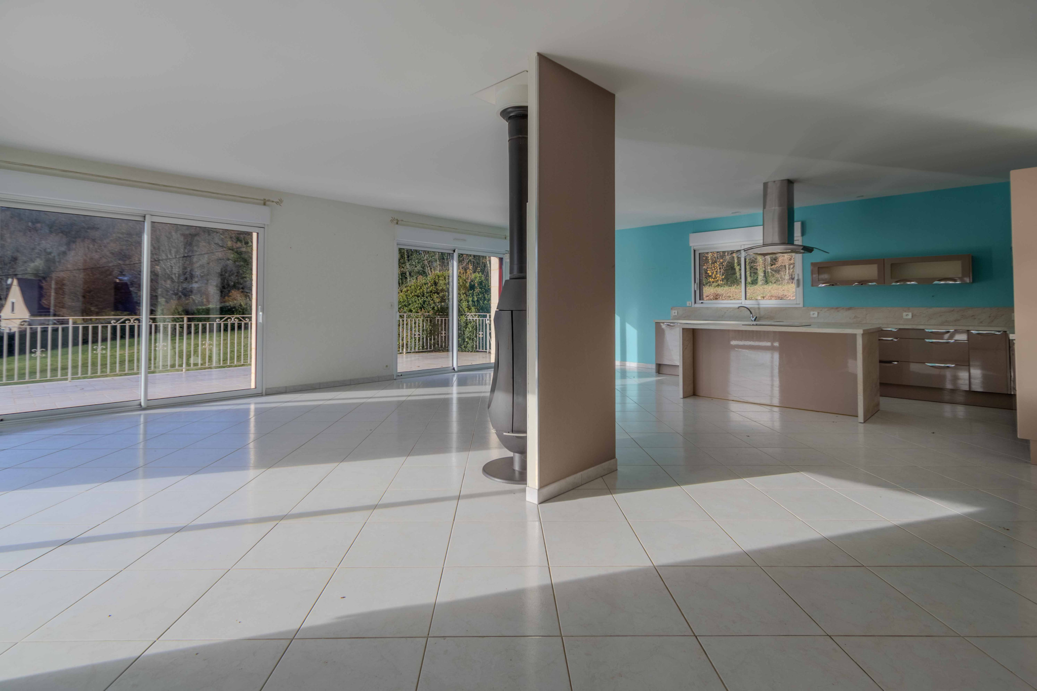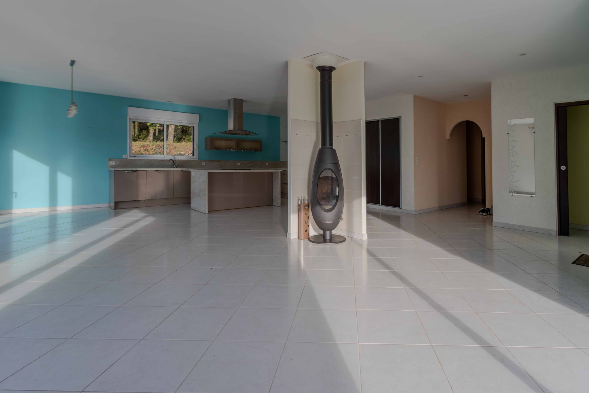 -Entrée ouvrant sur pièce de vie, séjour, salon, cuisine équipée et aménagée avec poêle à bois,