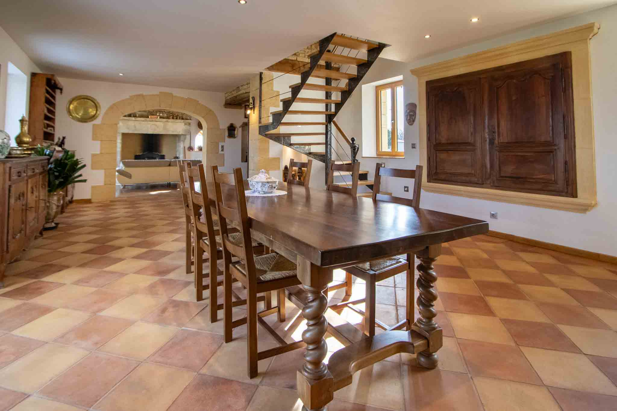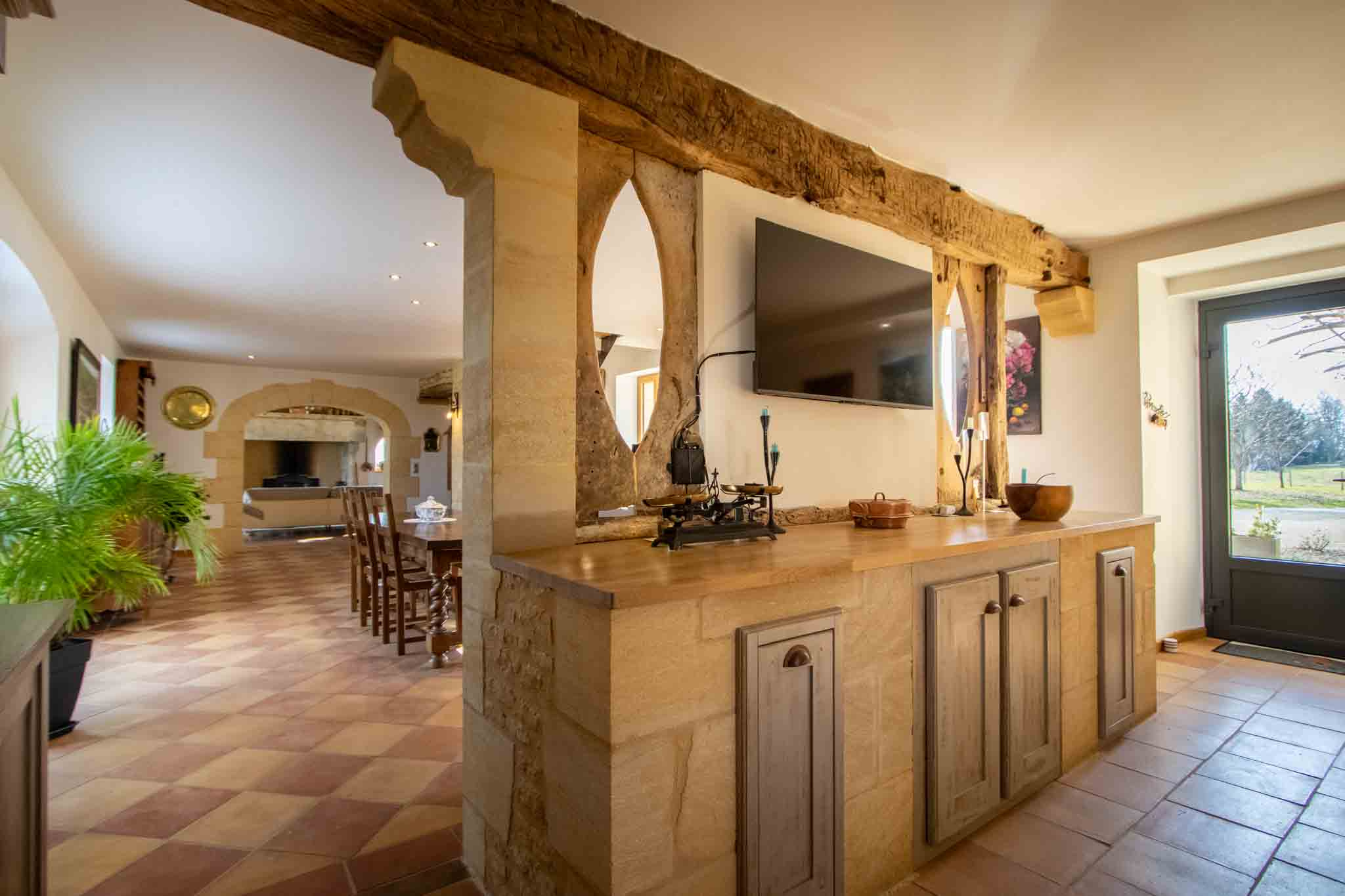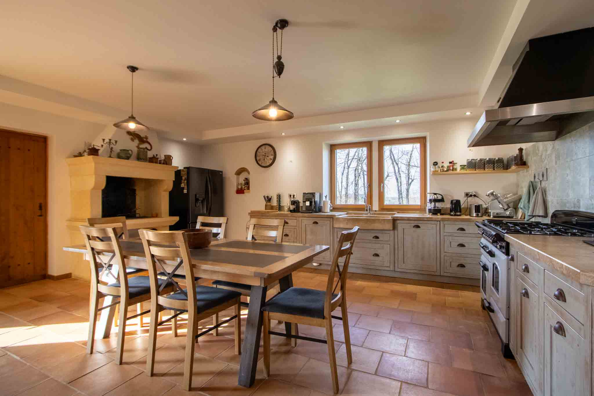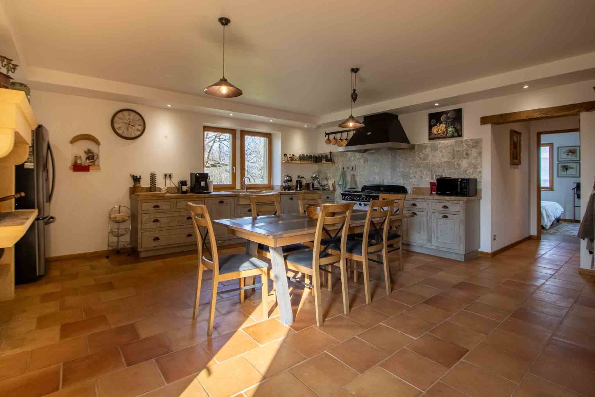 – Cuisine avec séjour et cheminée ouverte,