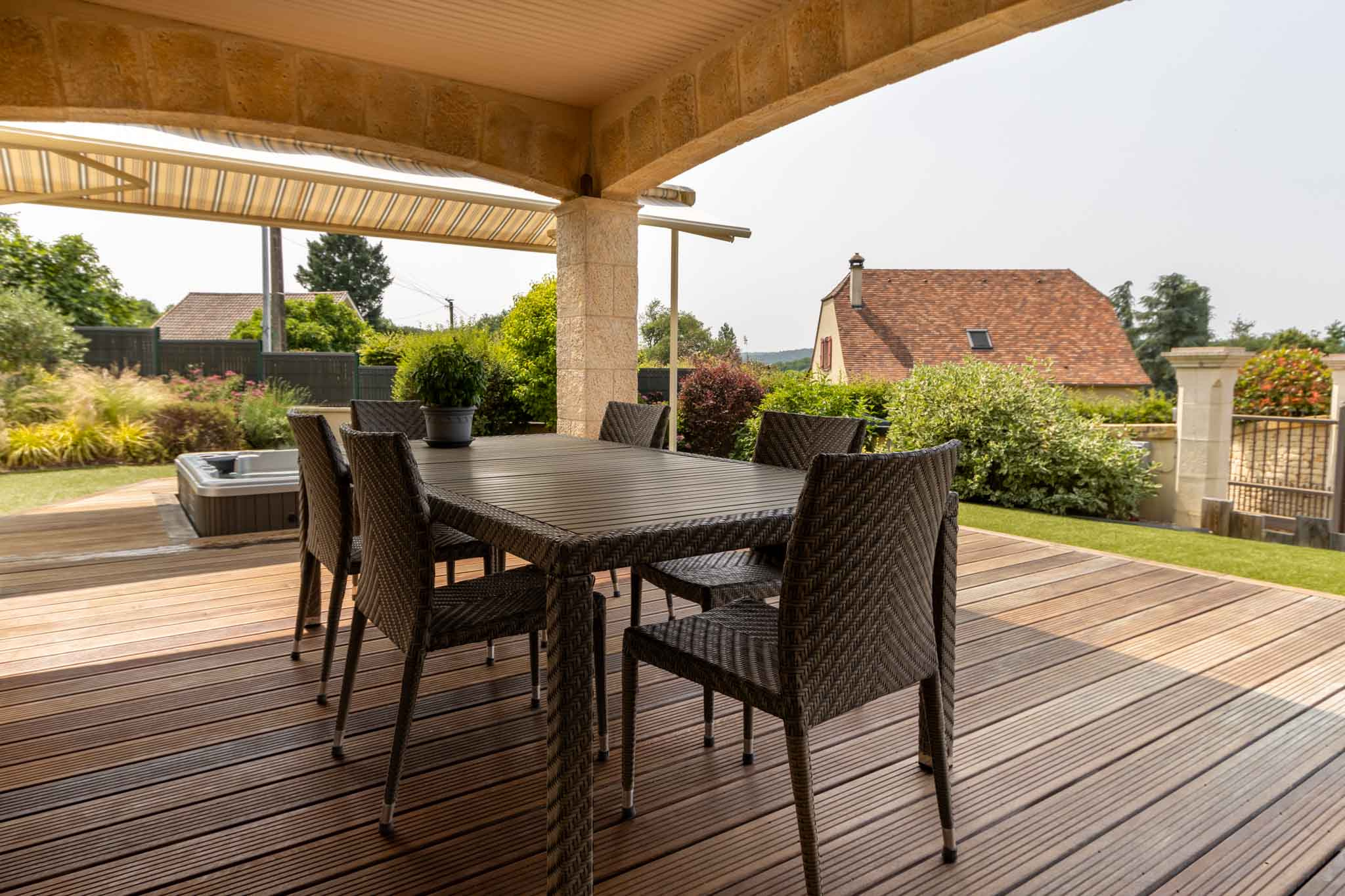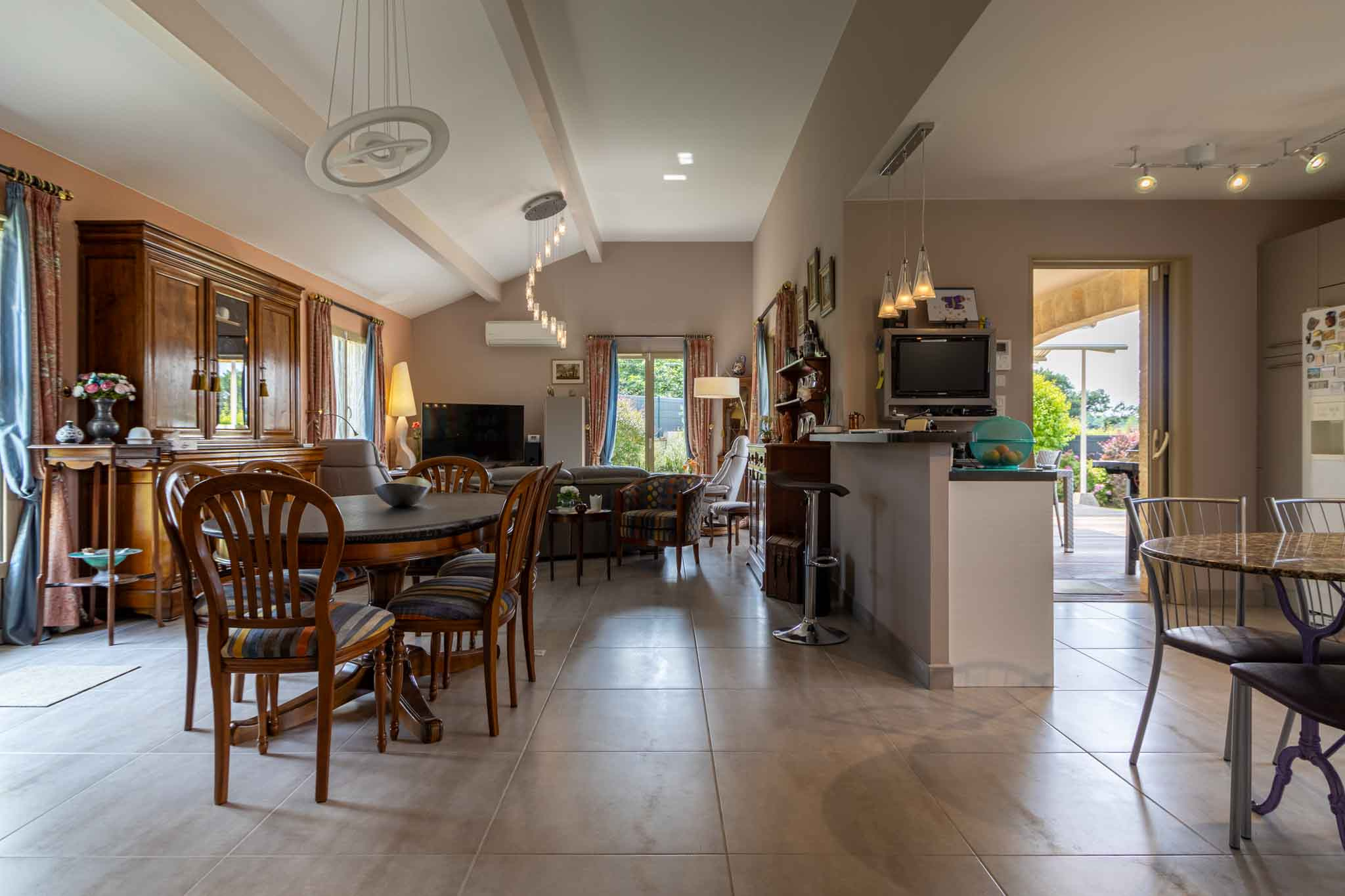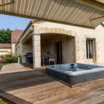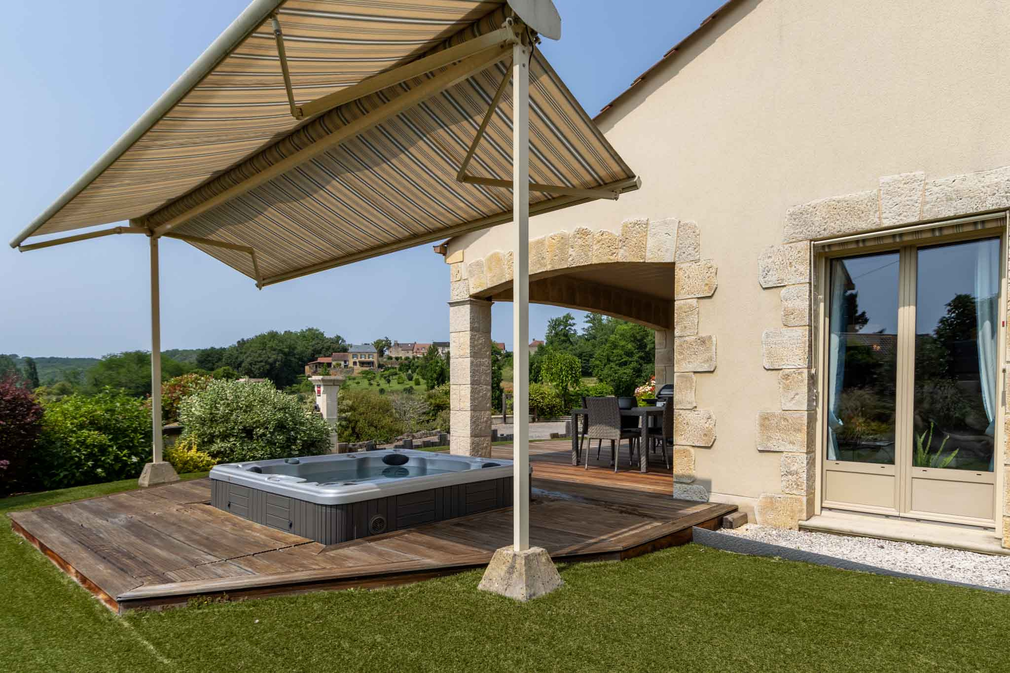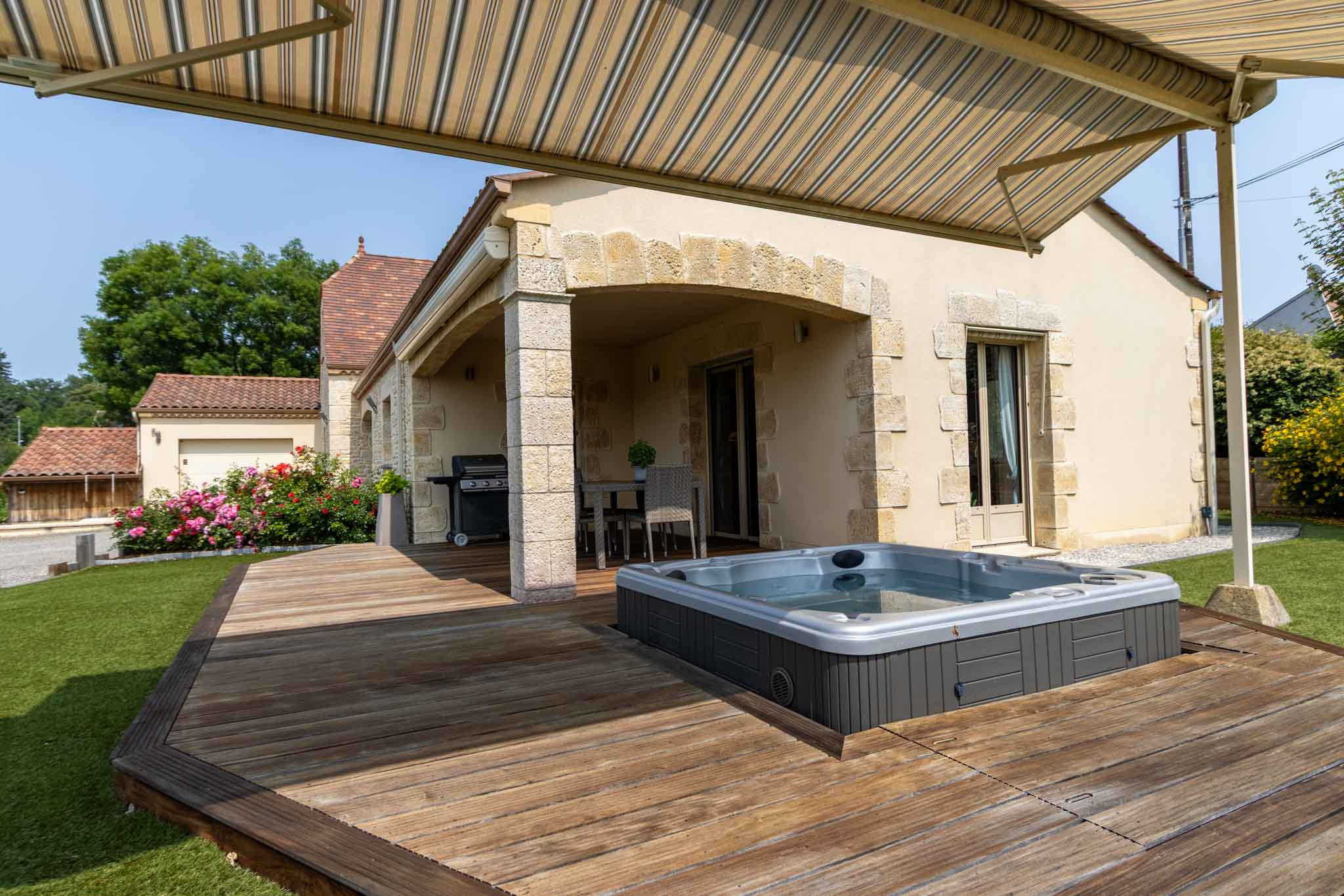 -Séjour, salon, cuisine équipée et aménagée ouvrant sur terrasse couverte et jardin avec jacuzzi,