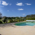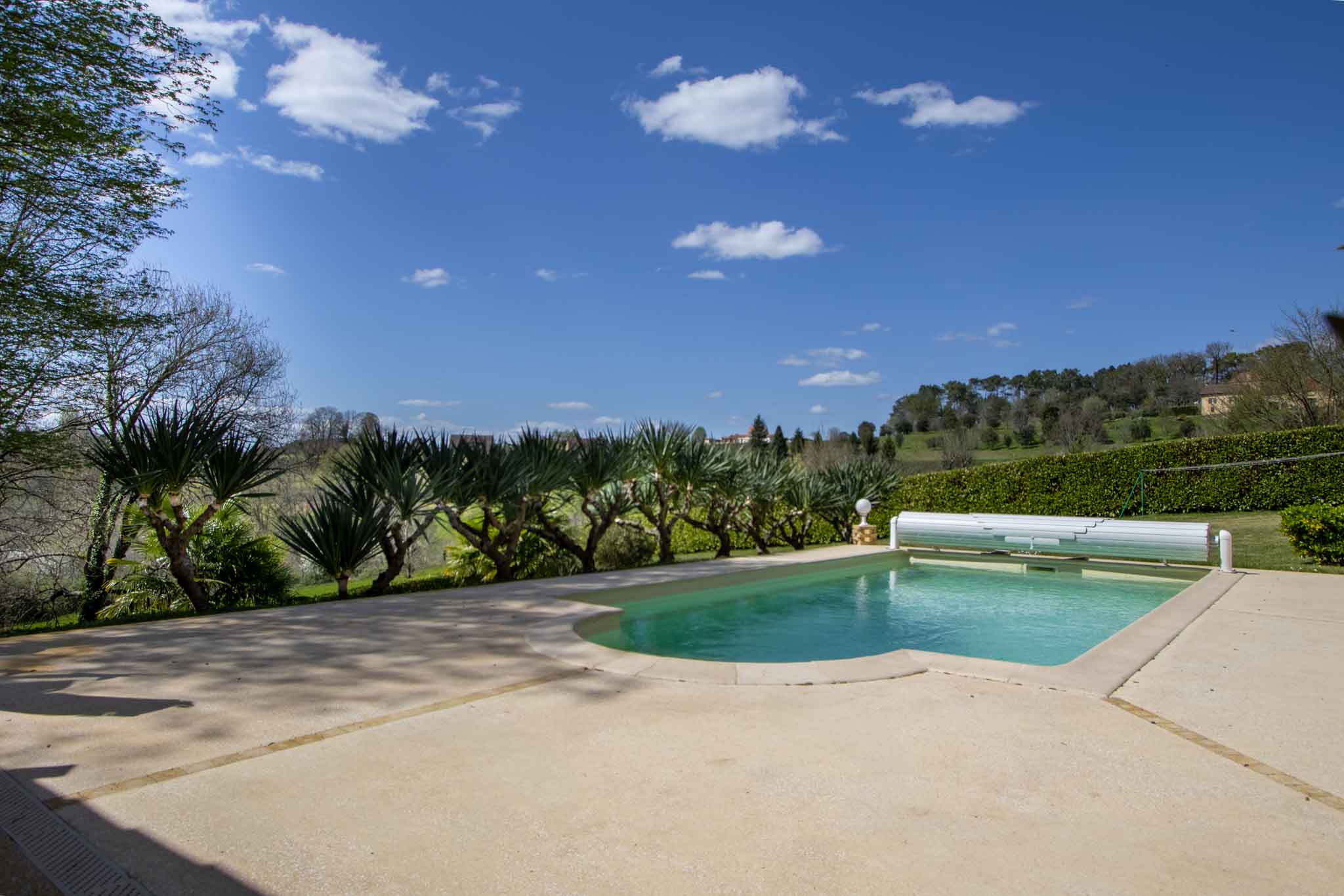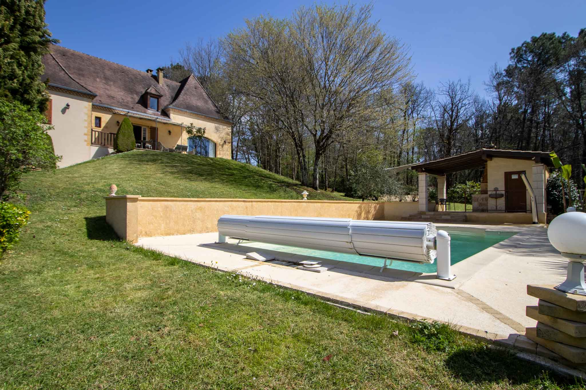 Piscine 7x4m avec volet motorisé et douche extérieure.