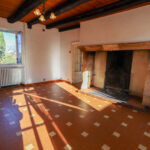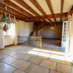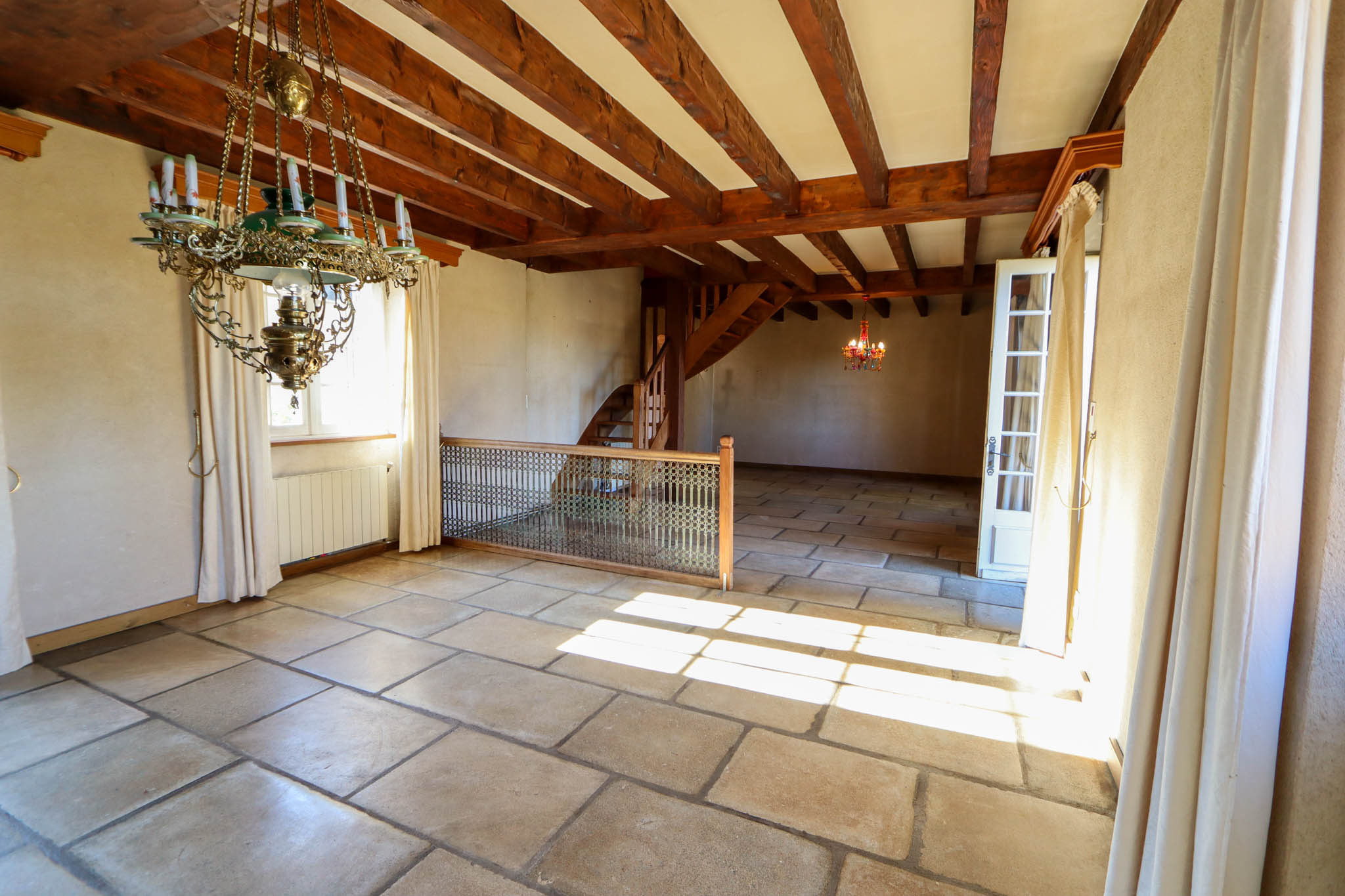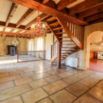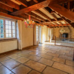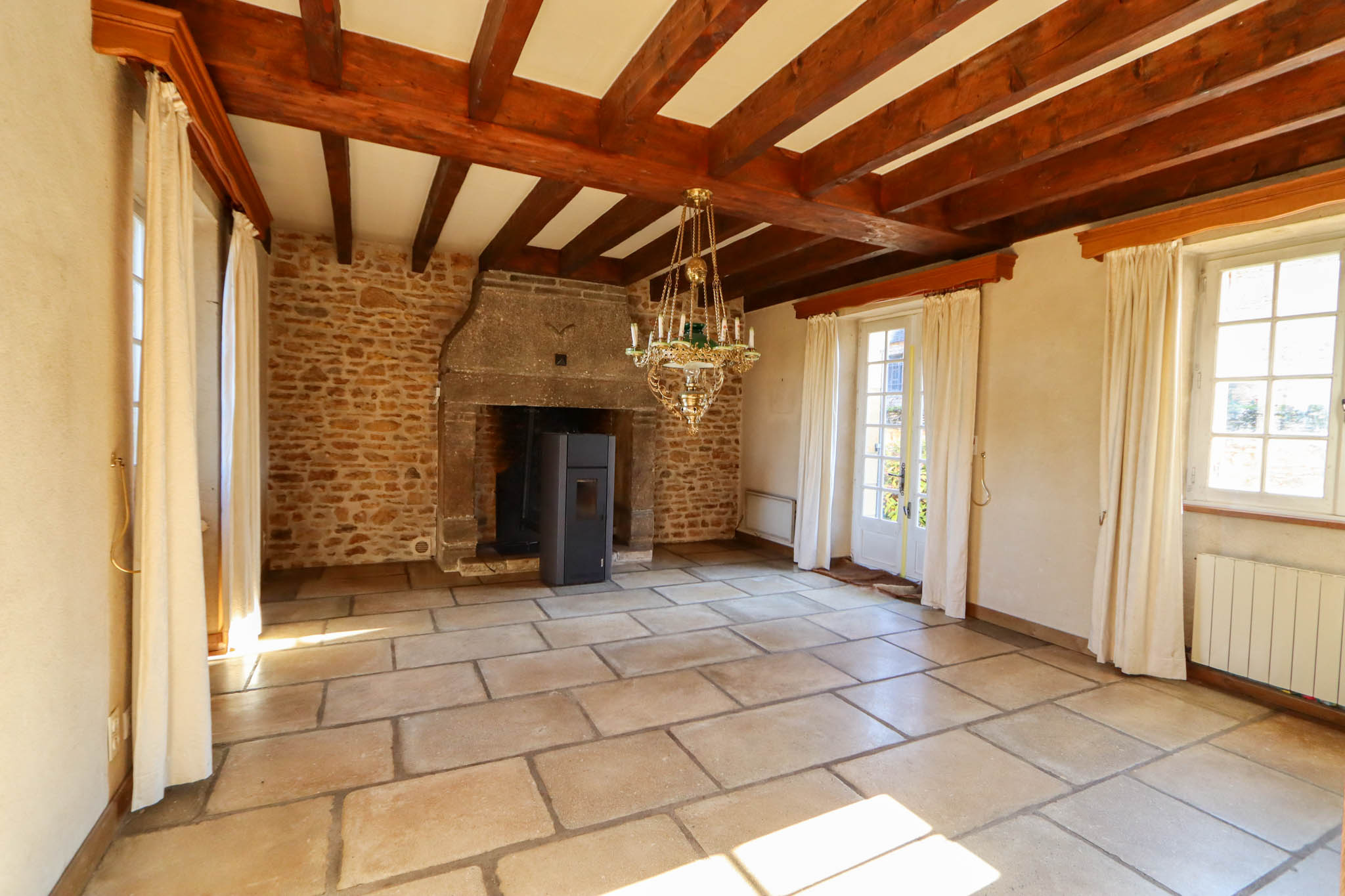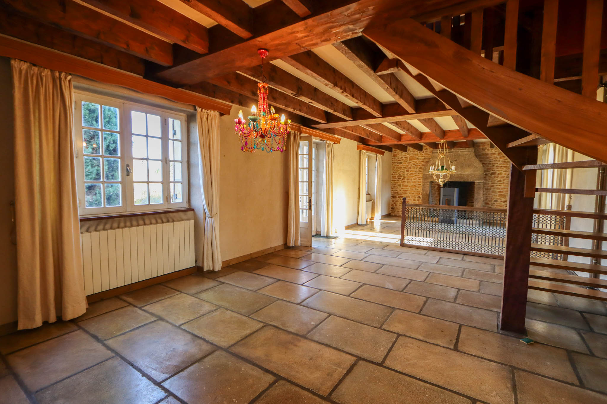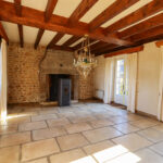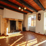 -Séjour-salon avec cheminée ouverte, poêle à granulé, sol pierre, poutraison,
