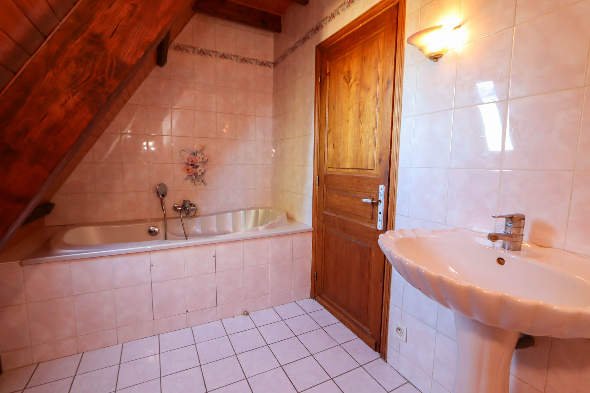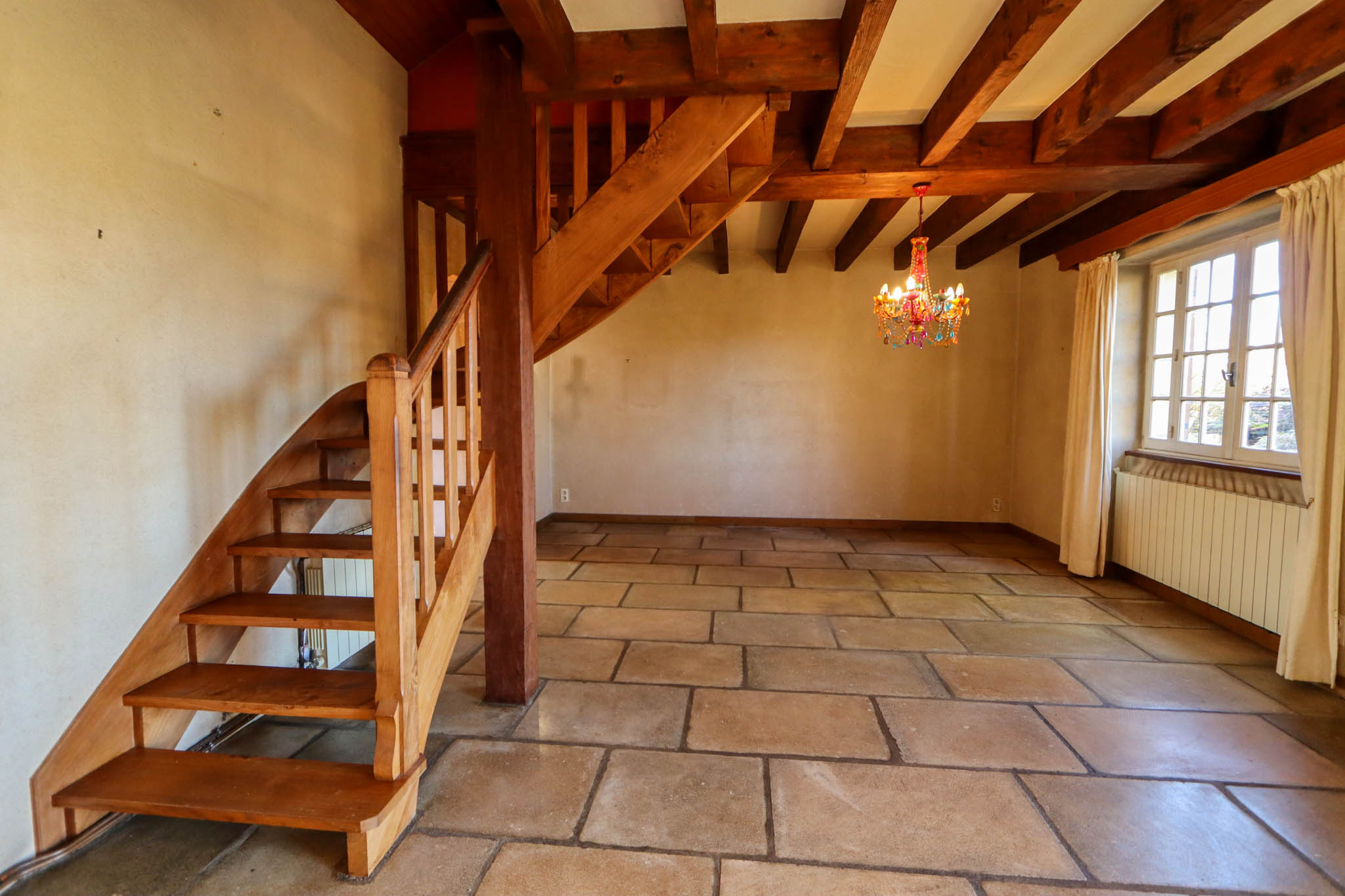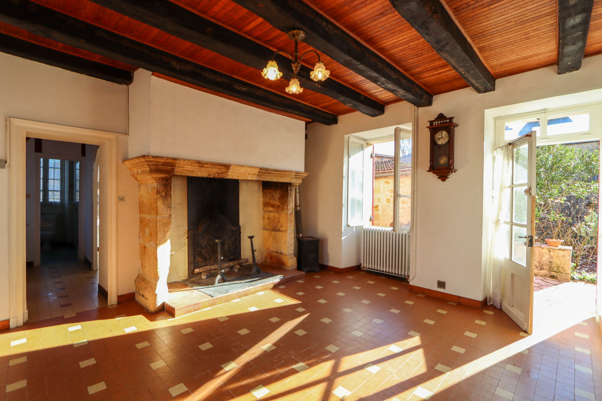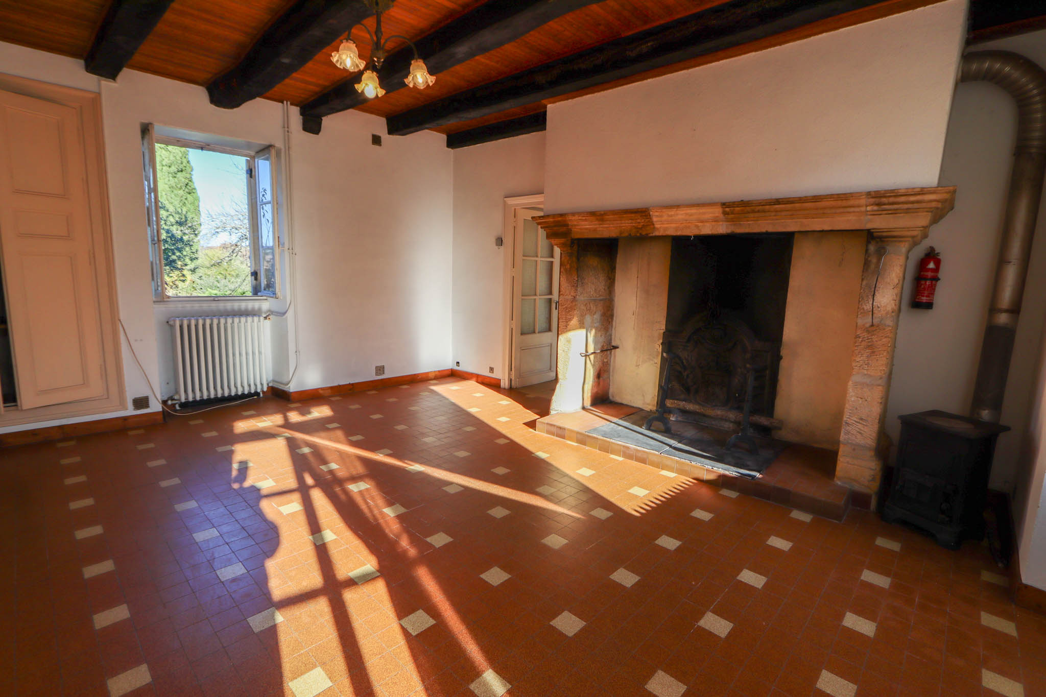 -Séjour-salon avec cheminée ouverte, poêle à granulé, sol pierre, poutraison,