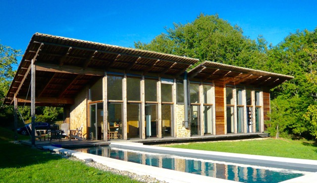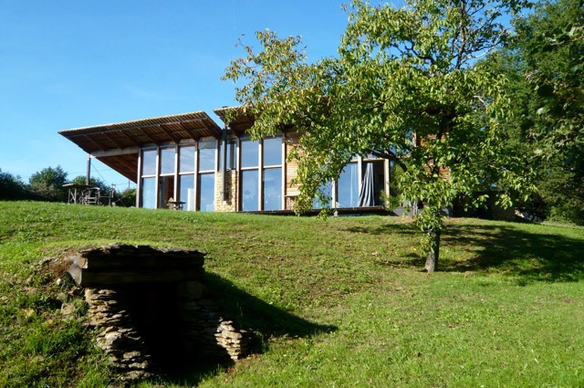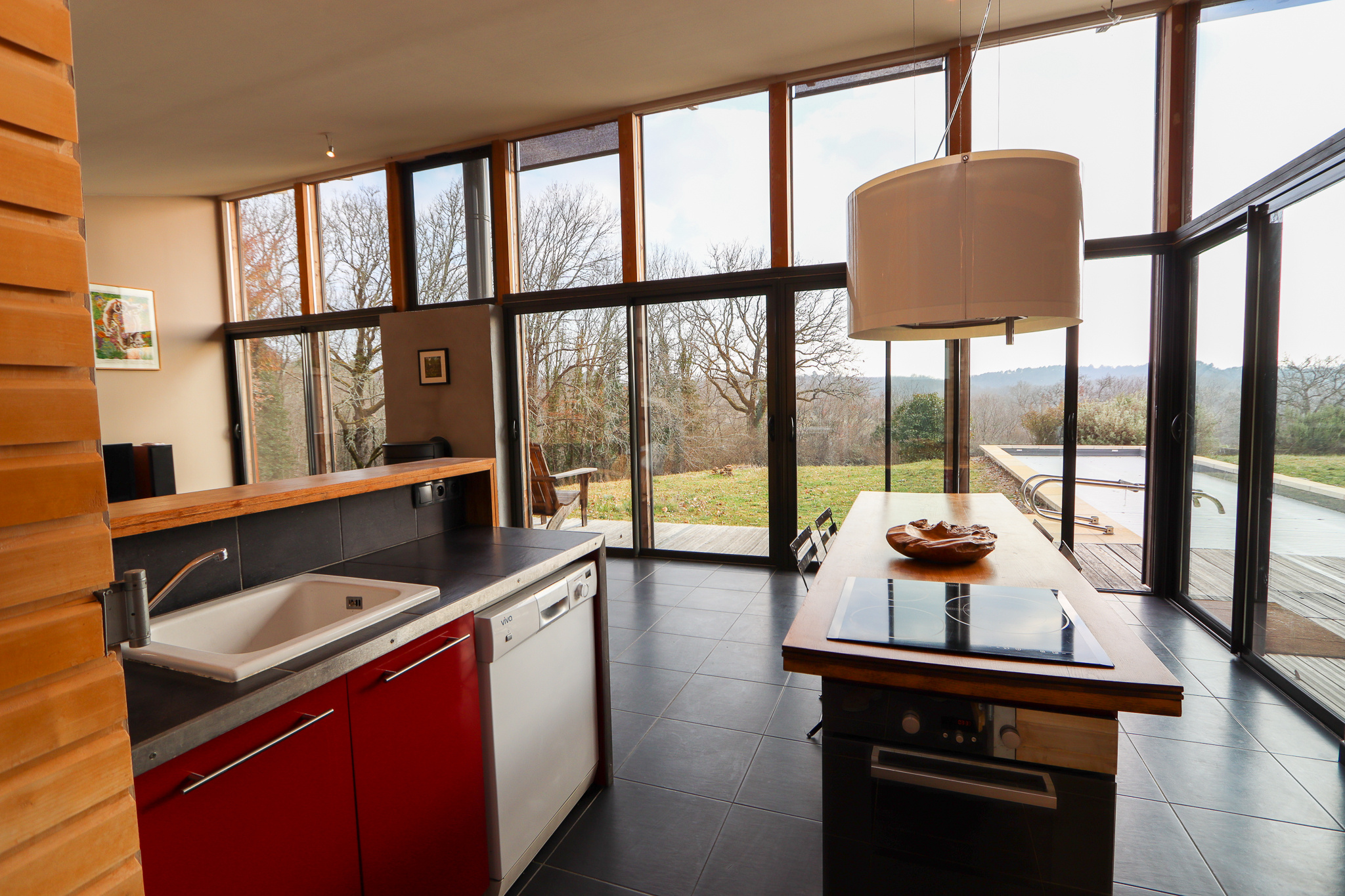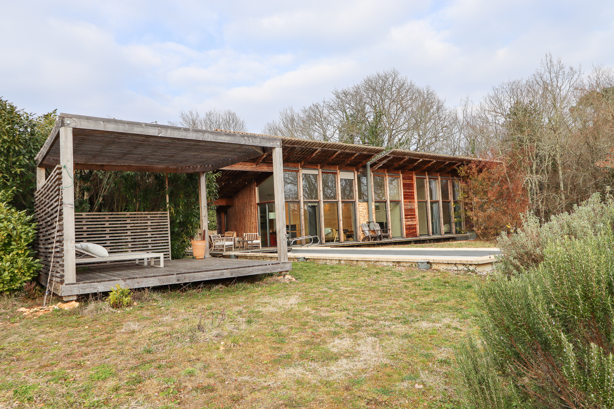 A 15 km à l’ouest de Sarlat et à 8 km des Eyzies, entre Dordogne et Vézère, au sommet d’une colline avec vue dominante, dans un environnement calme et protégé, maison d’architecte bioclimatique de 90 m2, ossature bois de Mélèze, ouverte sur la nature, parfaitement intégrée.