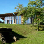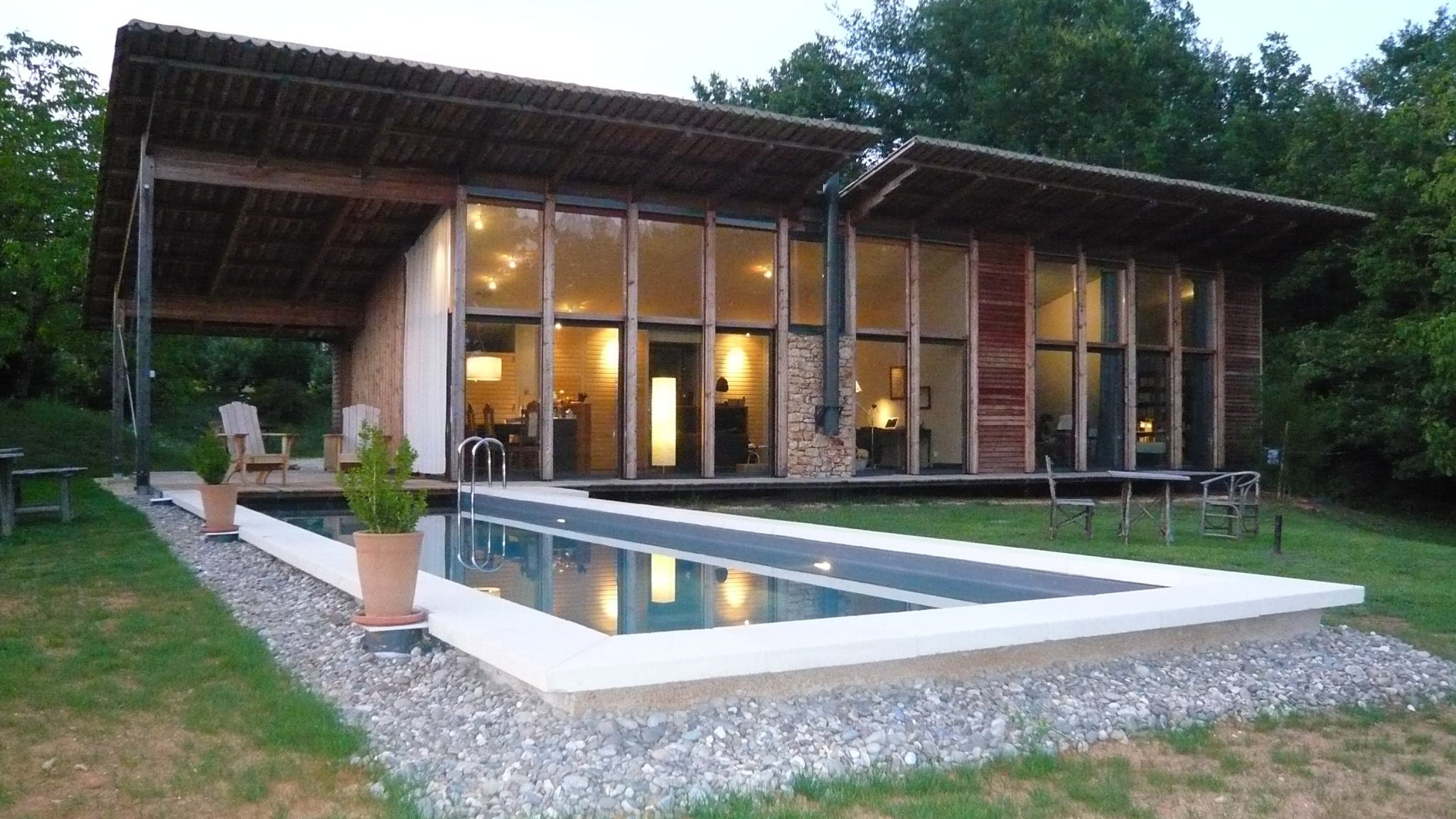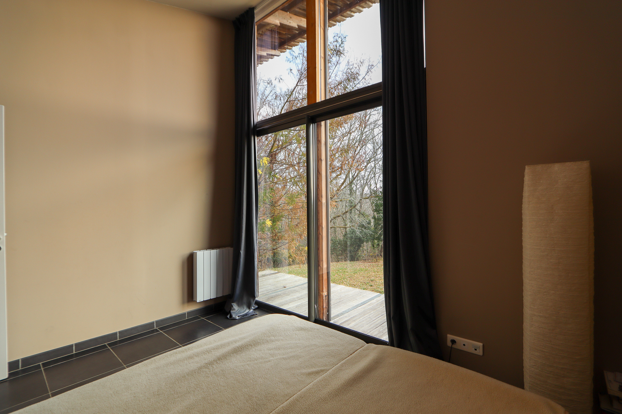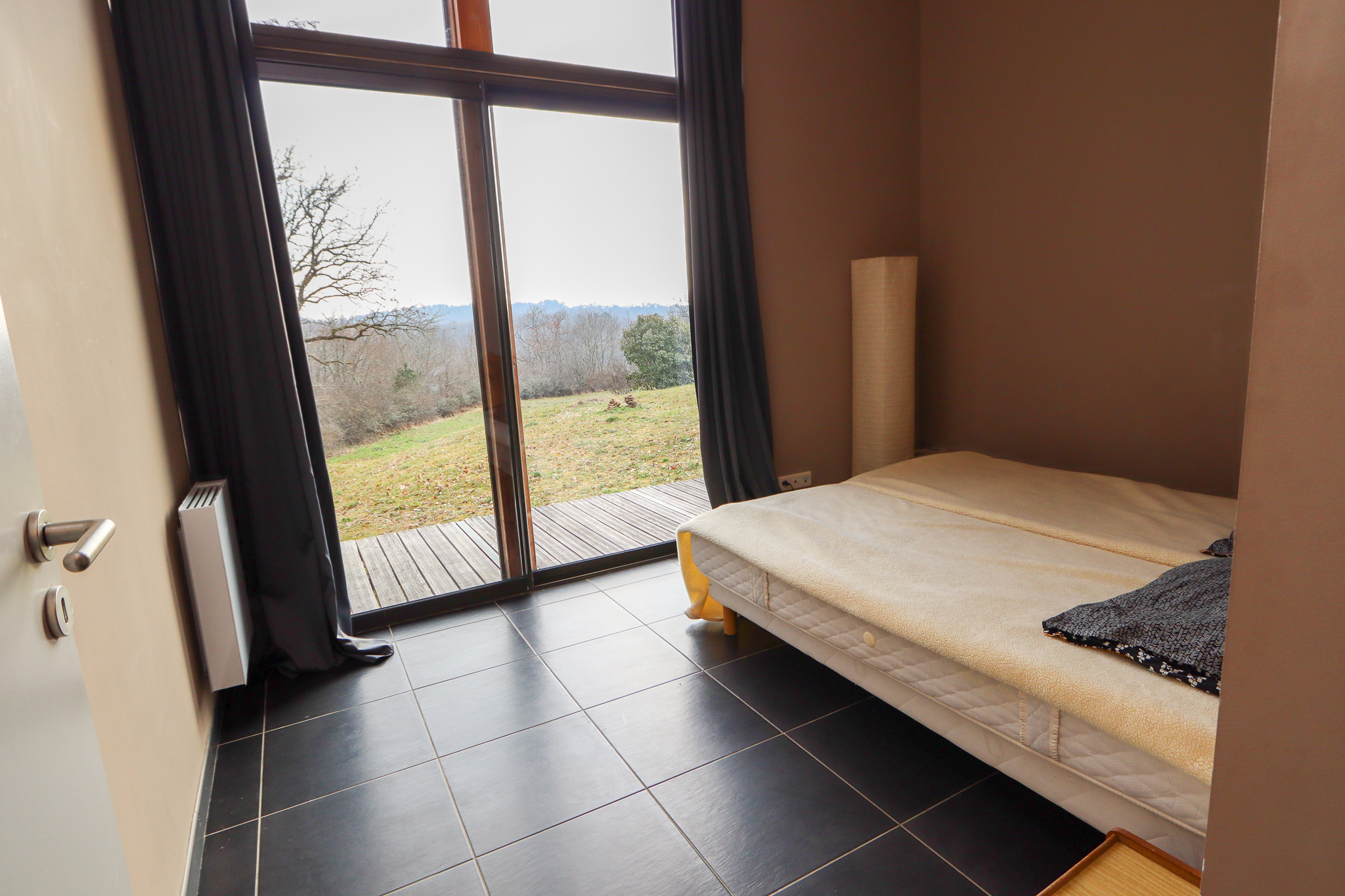 A 15 km à l’ouest de Sarlat et à 8 km des Eyzies, entre Dordogne et Vézère, au sommet d’une colline avec vue dominante, dans un environnement calme et protégé, maison d’architecte bioclimatique de 90 m2, ossature bois de Mélèze, ouverte sur la nature, parfaitement intégrée.