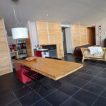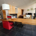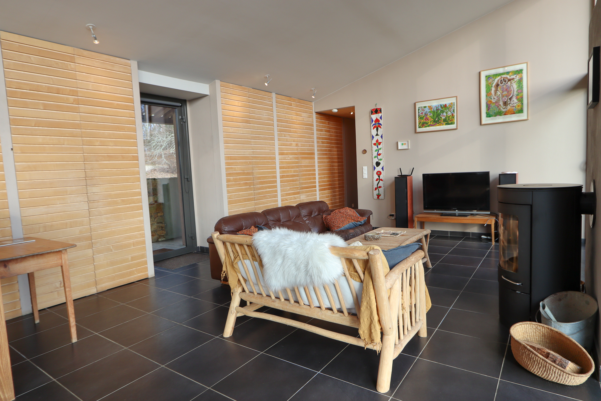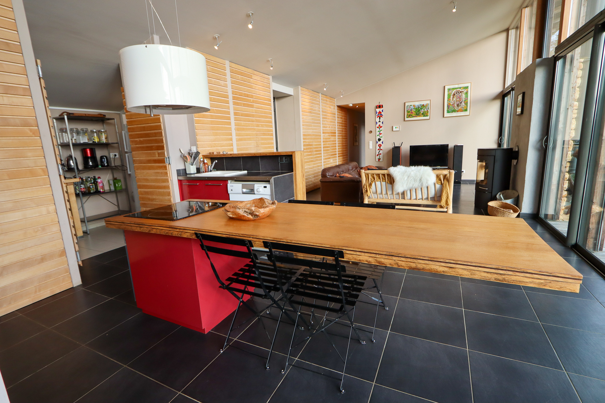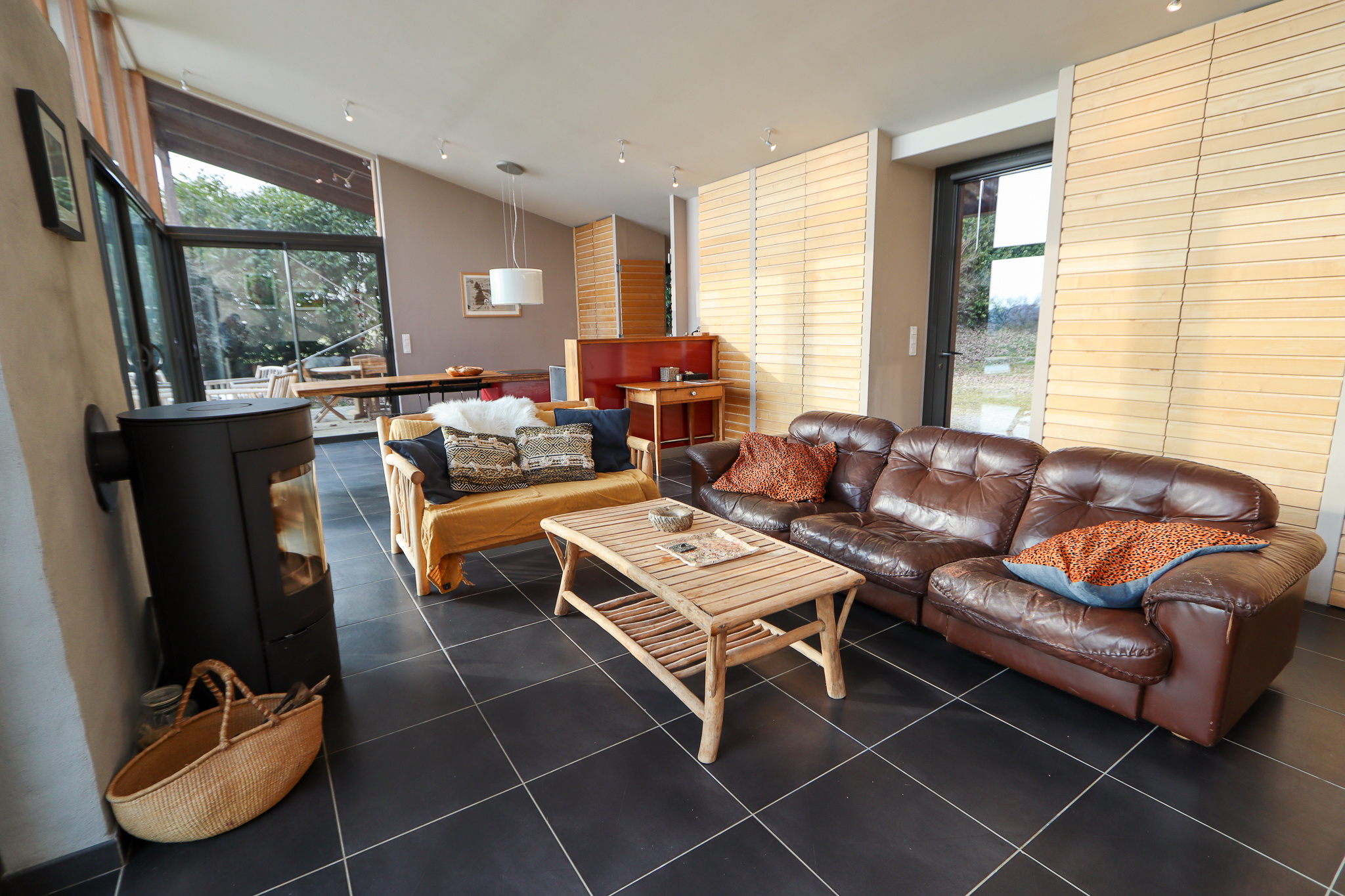 – Entrée dans la pièce de vie avec : Cuisine conviviale, arrière cuisine dite de préparation – Salon avec poêle à bois avec de beaux volumes dans un esprit verrière ouvert sur la nature