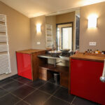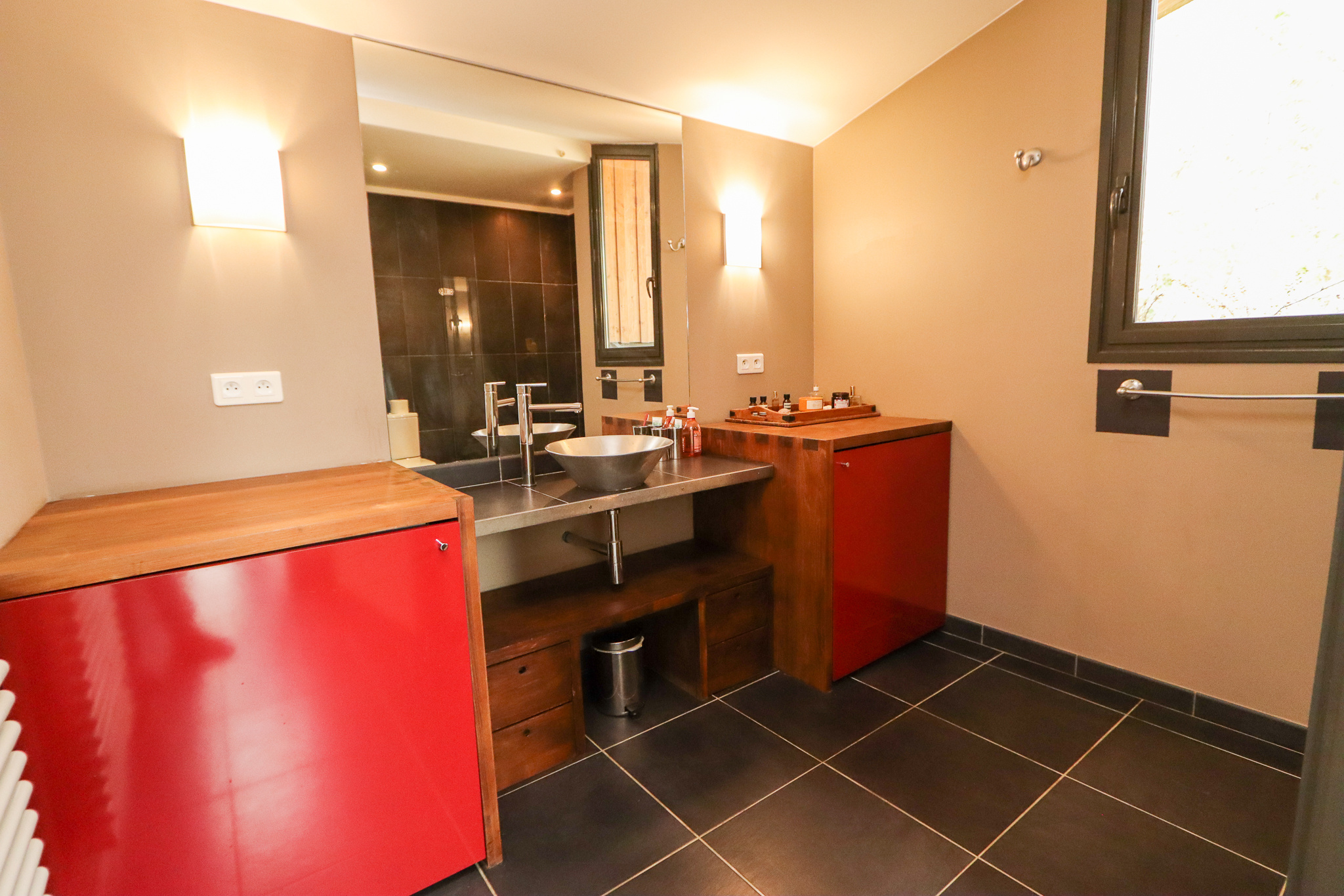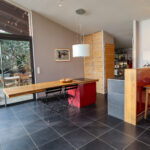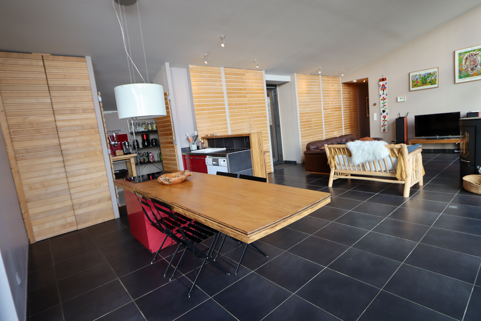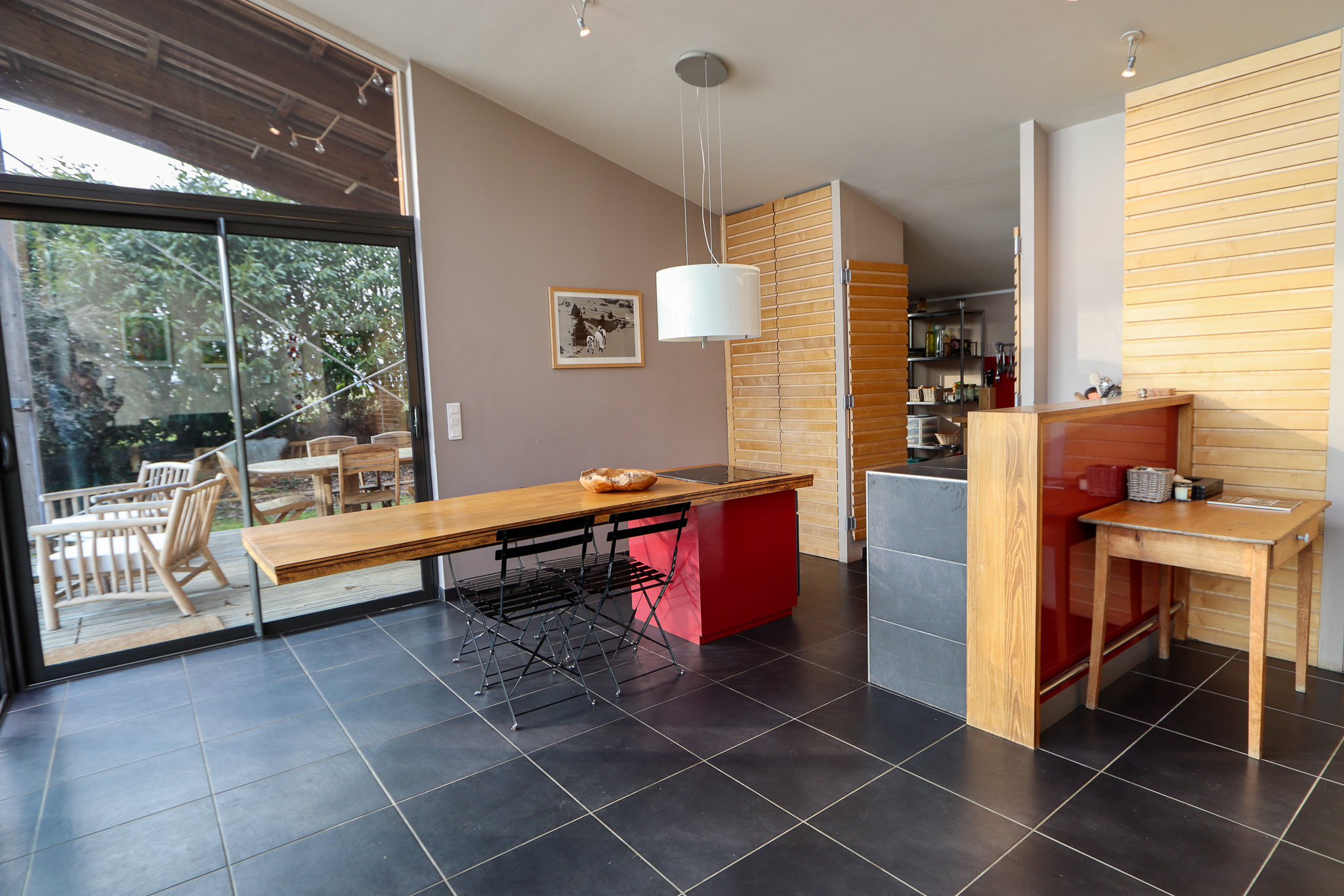 – Entrée dans la pièce de vie avec : Cuisine conviviale, arrière cuisine dite de préparation – Salon avec poêle à bois avec de beaux volumes dans un esprit verrière ouvert sur la nature