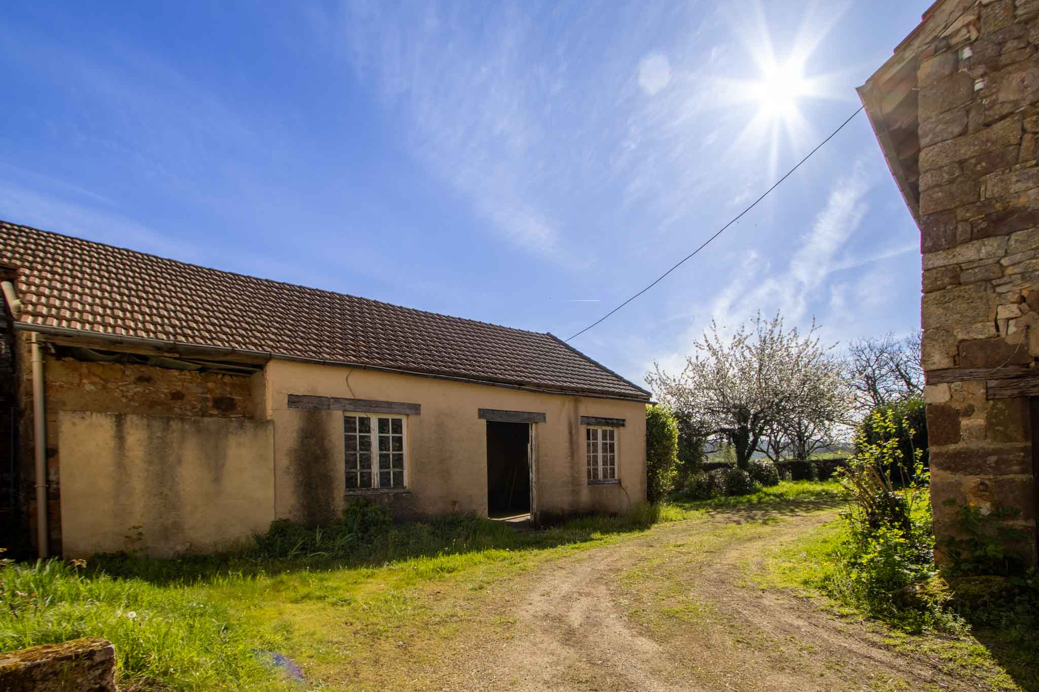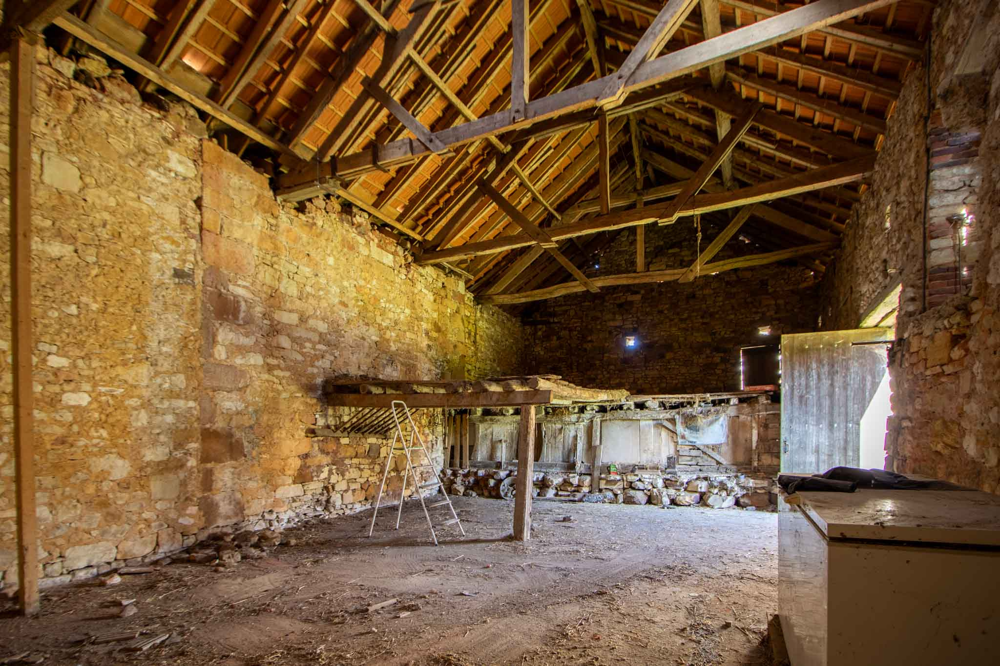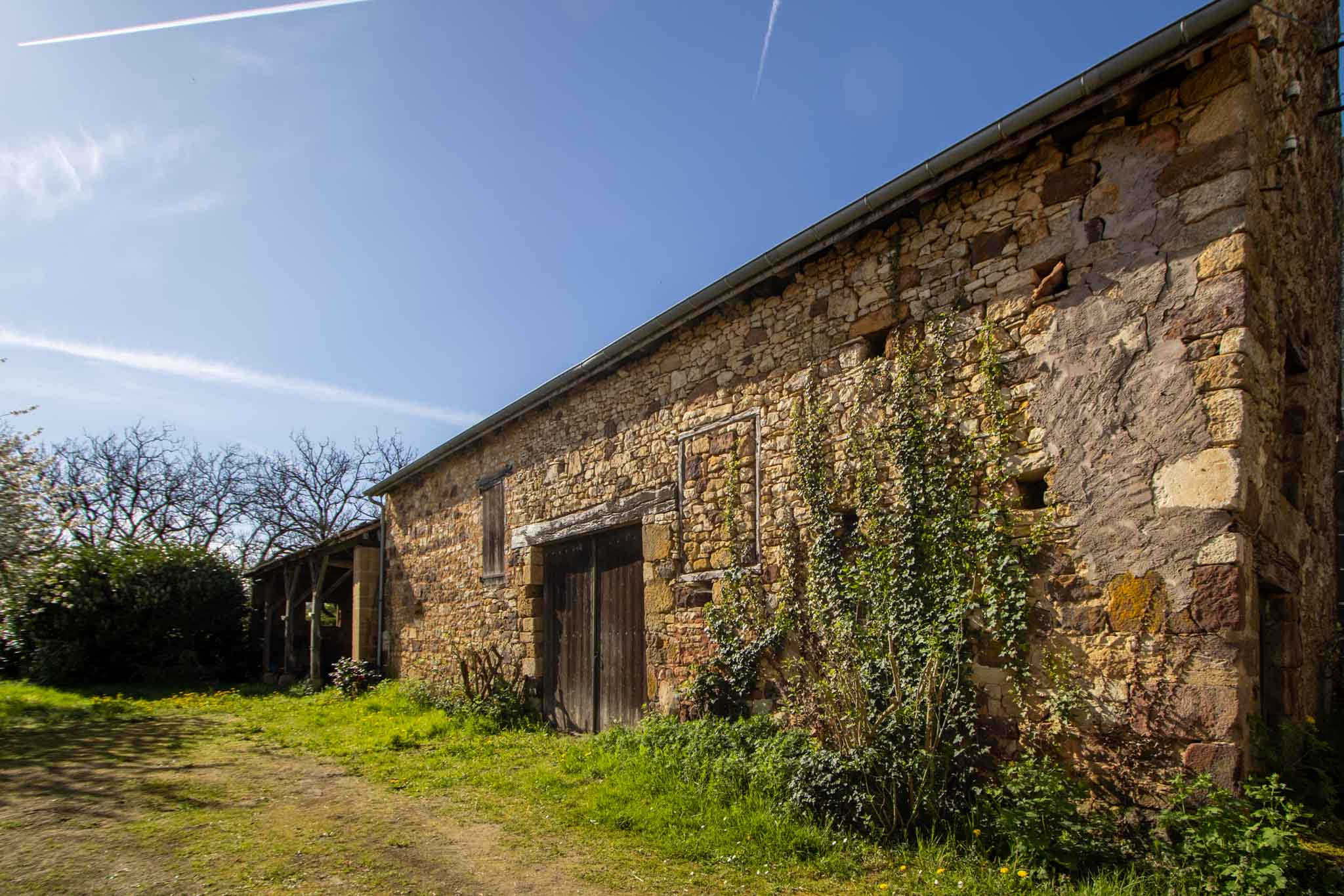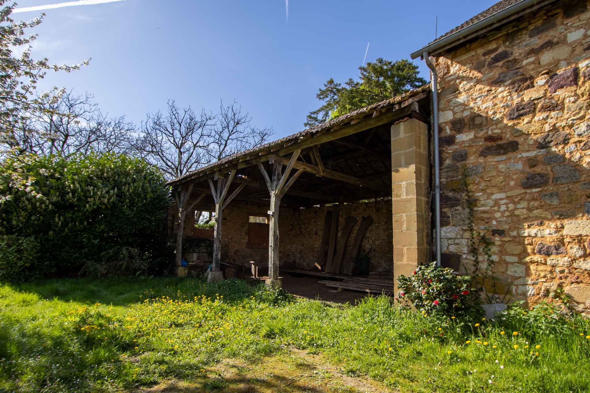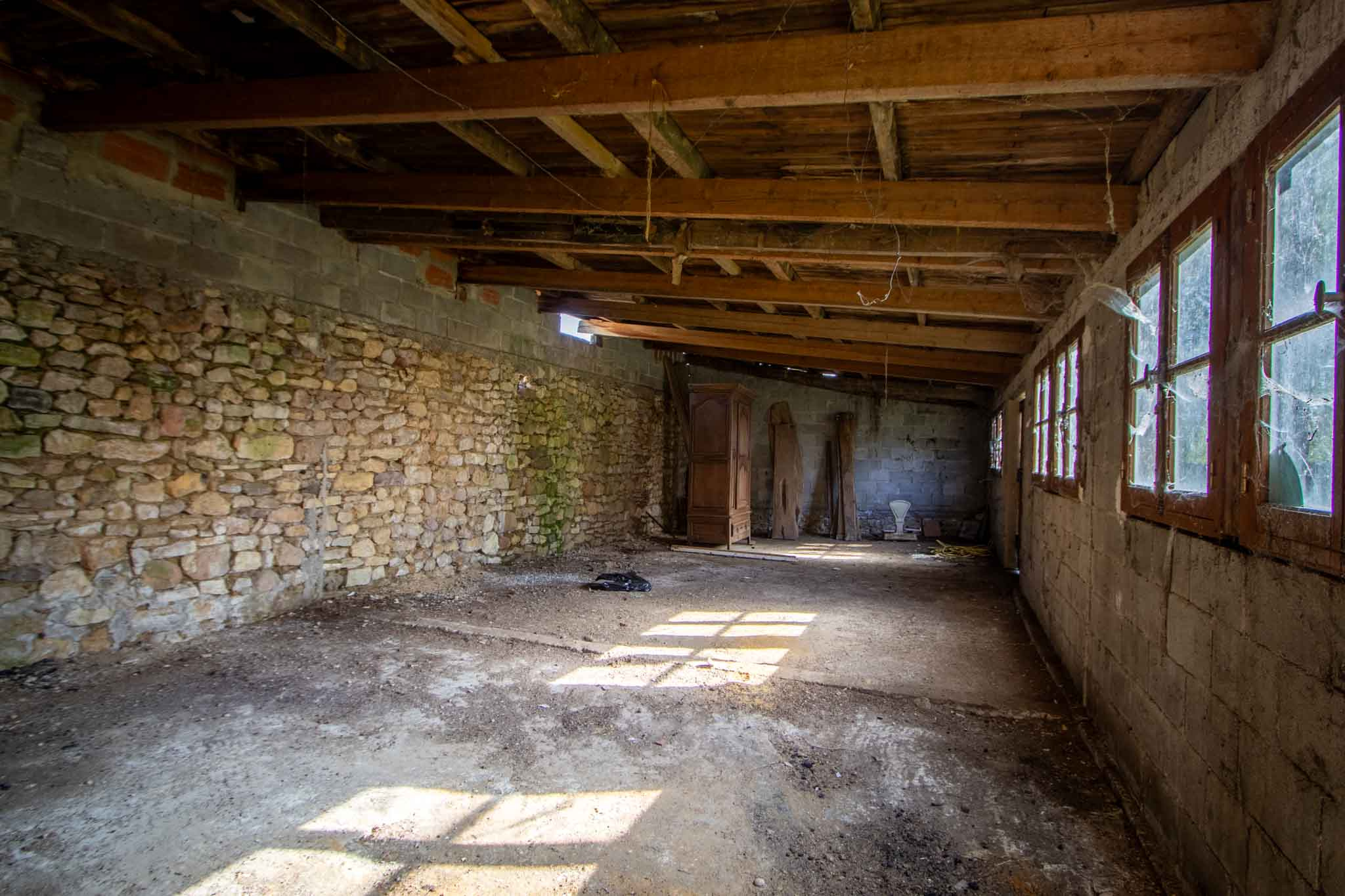 -Ancienne grange en pierre avec attenant un préau couvert.