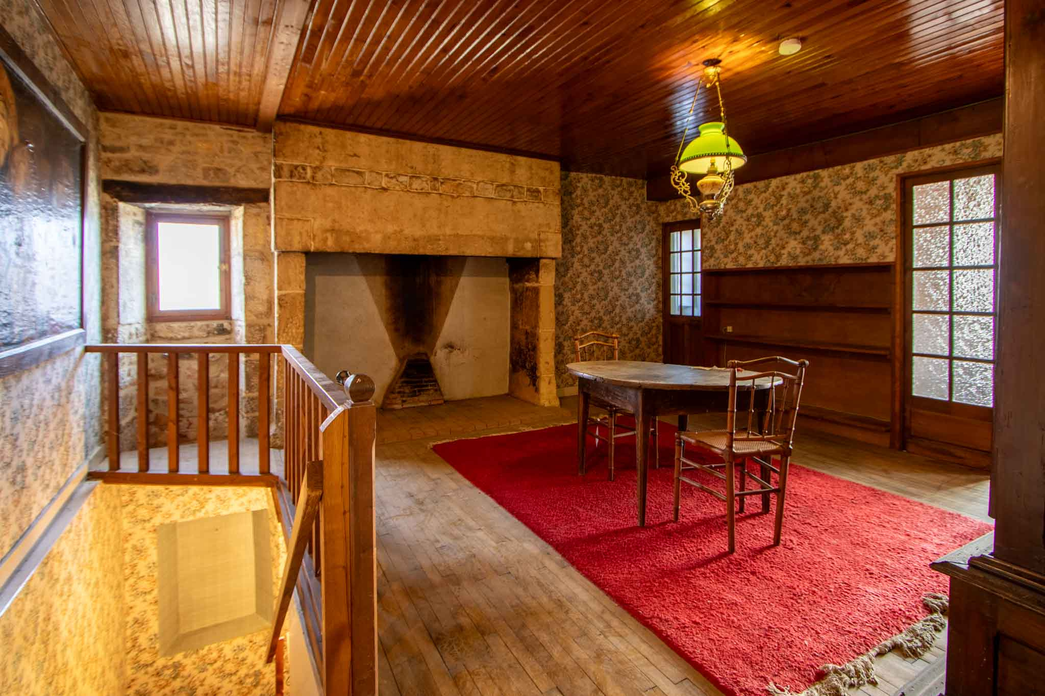 -Mezzanine, coin salon avec cheminée pierre, parquet bois,