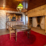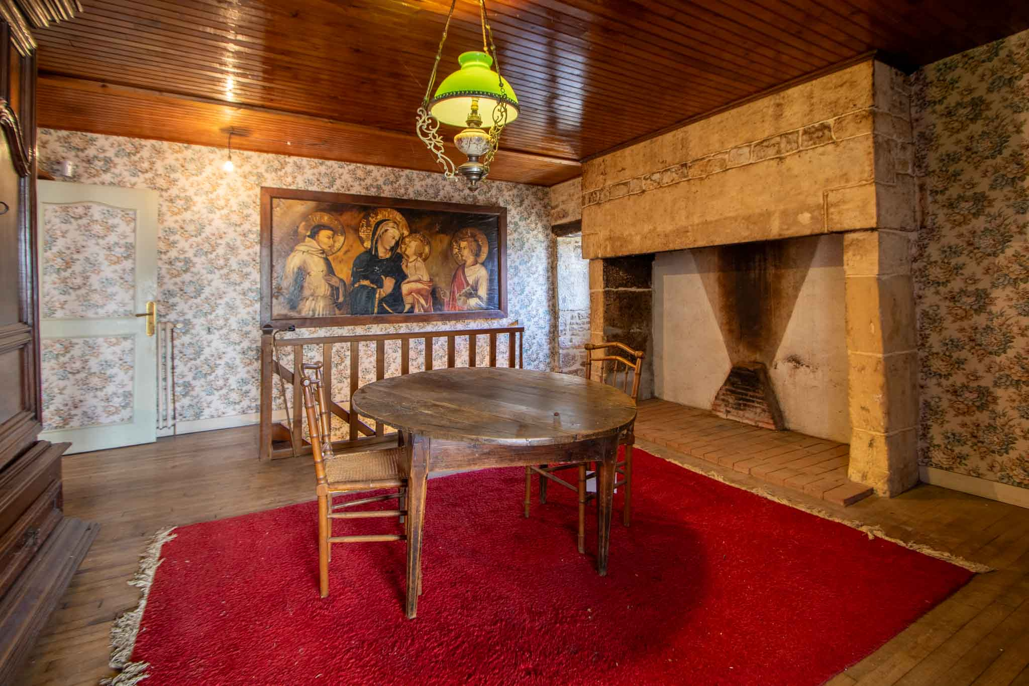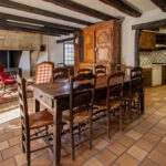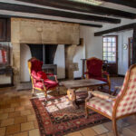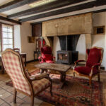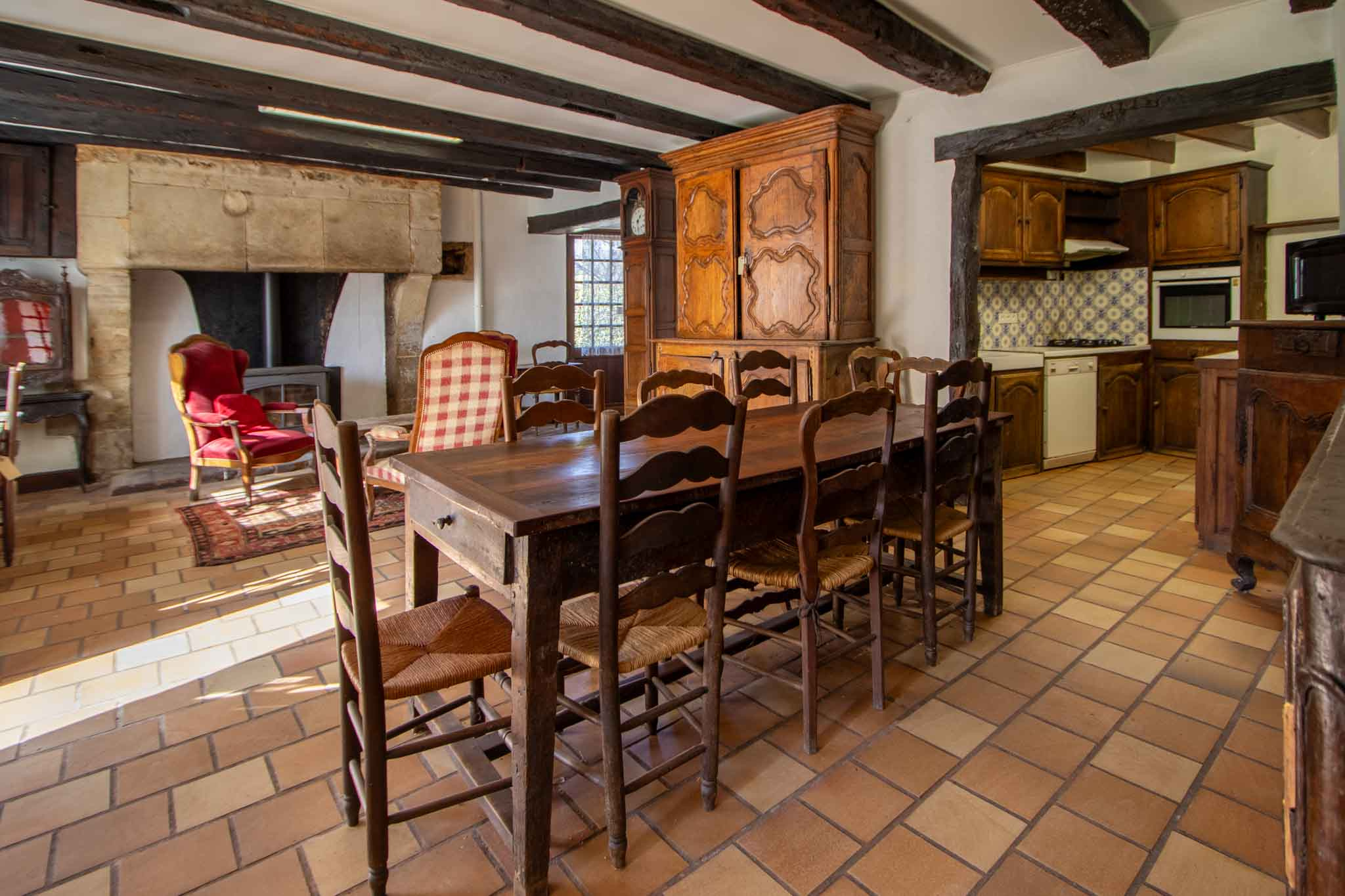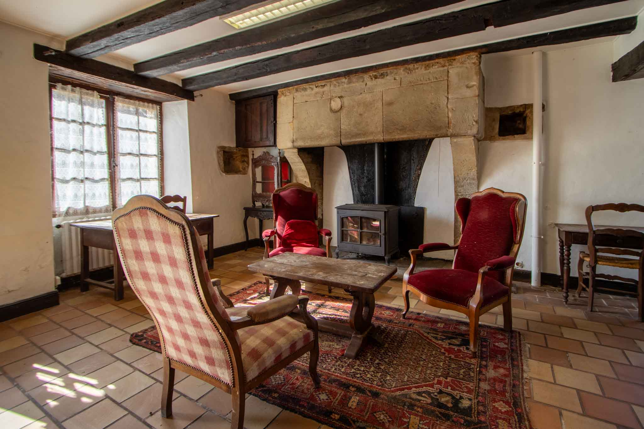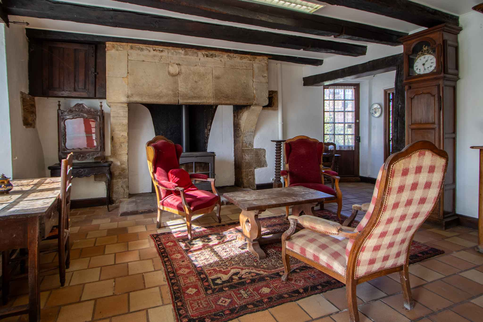 -Entrée ouvrant sur séjour salon avec cheminée pierre, poêle à bois, poutraison,