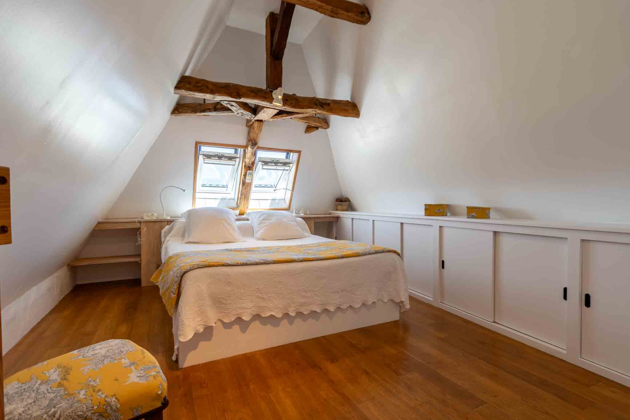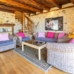 -Salon avec parquet bois,cheminée et poutraison ouvrant sur la terrasse en balcon.
